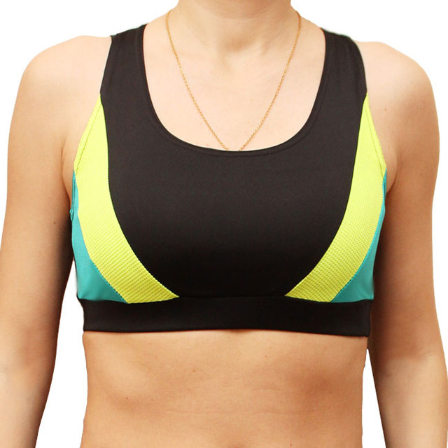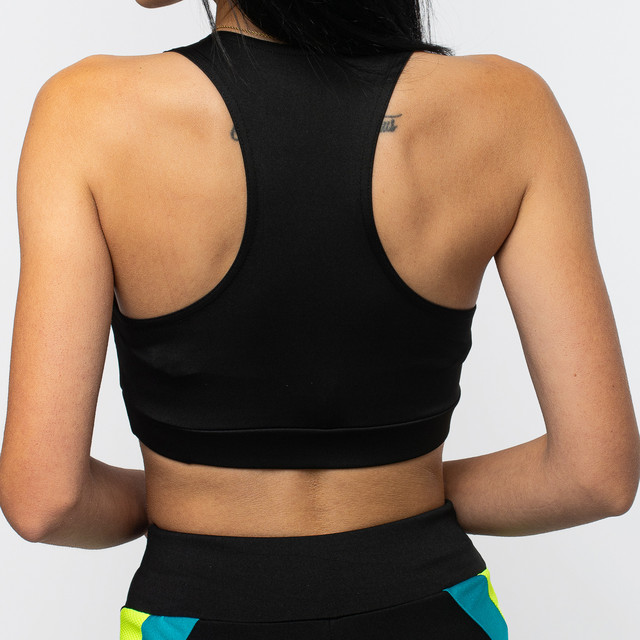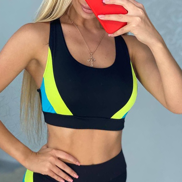 Чорний жіночий спортивний топ із яскравими вставками жовтий + синій